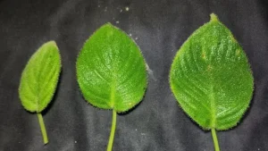 Selain permukaan daun yang dipenuhi rambut halus, tanaman ini juga memiliki ciri lain seperti tangkai daun yang relatif pendek, bagian bawah daun dan tangkai yang berbintil, serta bunga jantan berbentuk kerucut.