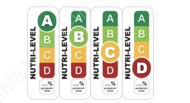 Label Nutri Level akan dicantumkan pada berbagai media, mulai dari daftar menu, kemasan, hingga platform digital. Sistem ini menggunakan kategori huruf A hingga D dengan kode warna, dari hijau hingga merah, untuk menunjukkan tingkat kandungan GGL.